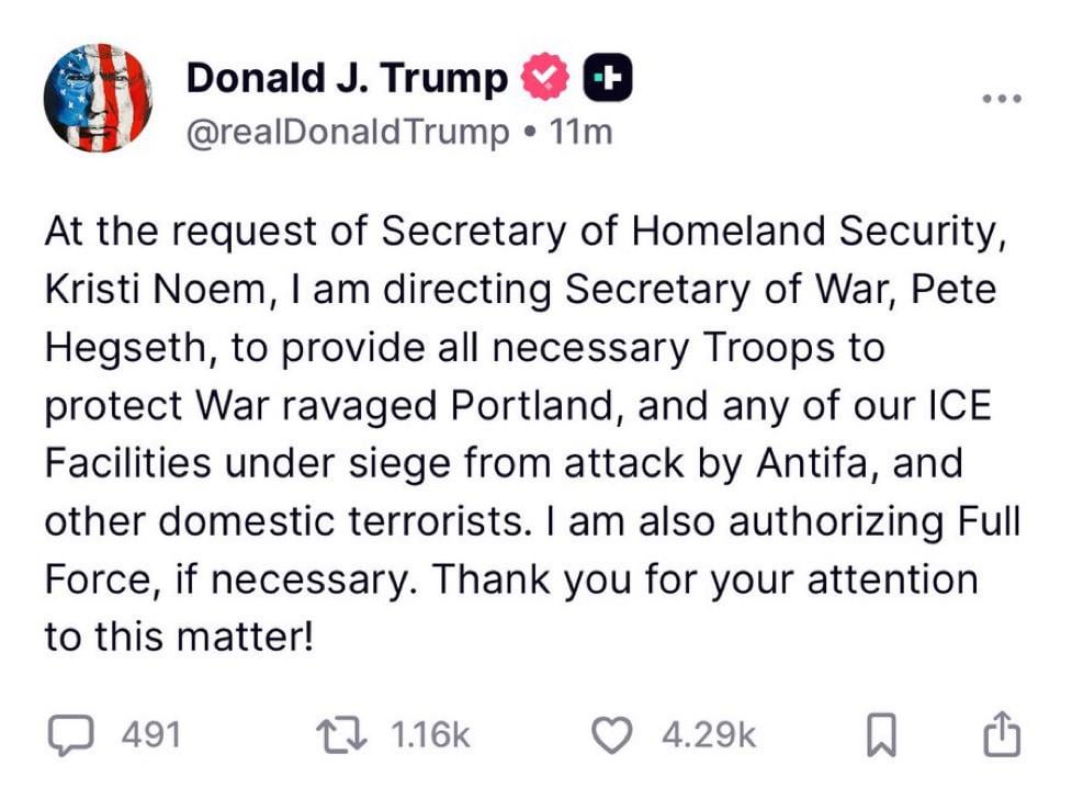 18. Trump is sending troops to Portland to, per his words, kill anyone he doesn’t like. You can’t “give” war to someone if they’re already shooting at you, OP. That’s not how this works. Optic politics are dogshit, and we should all be grown up enough to admit it; it doesn’t matter what reaction the locals have to this.