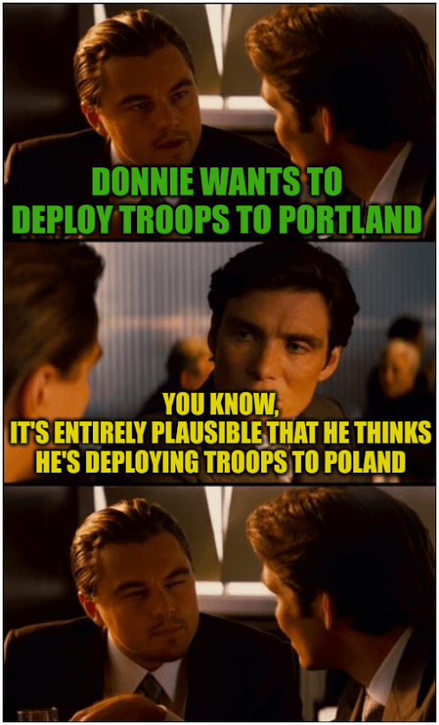 1. The Russians have been flying drones over Portland. A bold move to send troops. It’s a good thing President Trump has access to the best intelligence reports for making these decisions.