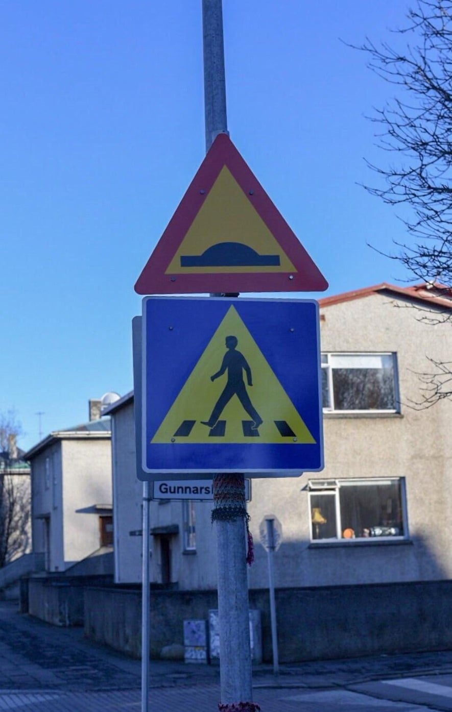 Speed bump and cross walk signs in Iceland look like alien abduction