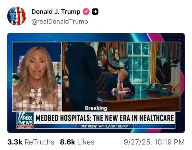 Donald Trump posted a fake AI generated FOX News Report announcing “MedBed Hospitals” (a technology that doesn’t exist) + that every American will soon receive their own MedBed Card