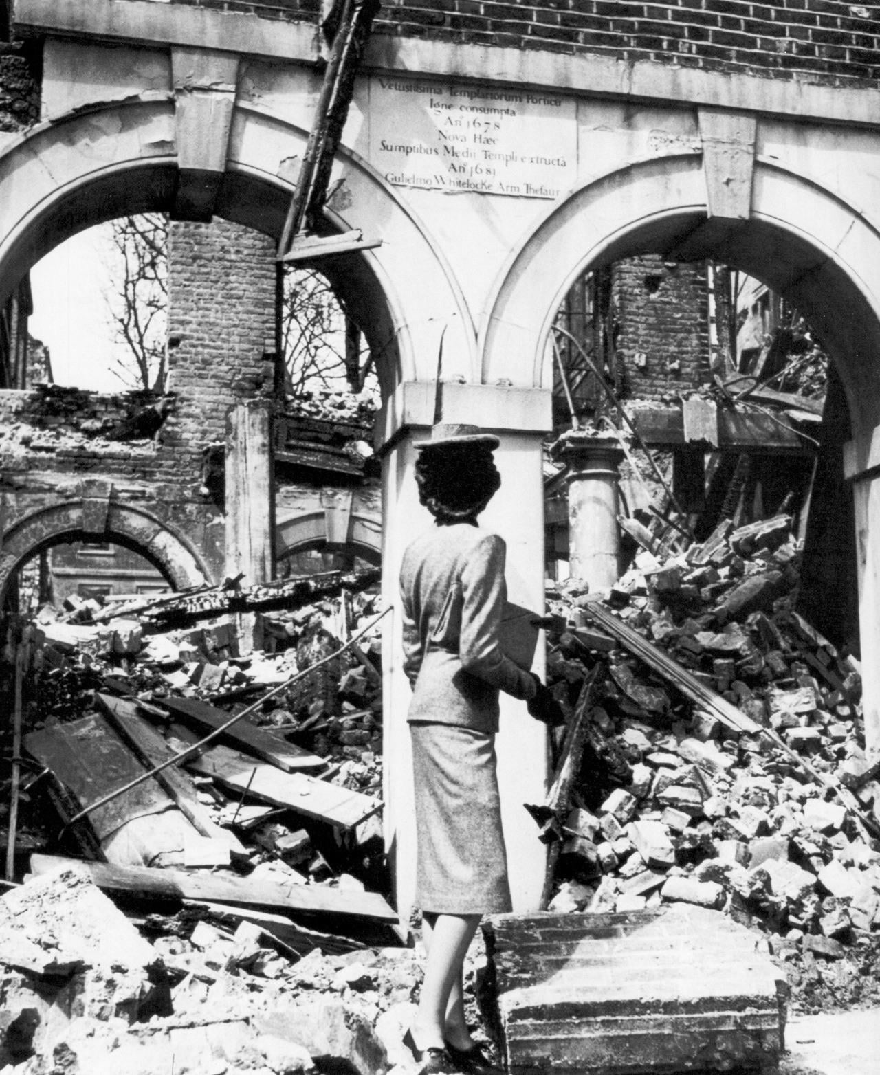 Here, on assignment for British Vogue and subsequently published in their September issue of 1941, Beaton depicts Elizabeth Cowell, the BBC’s first female television announcer, in a Digby Morton suit and Hugh Beresford hat, gazing over the ruins of London’s Middle Temple.