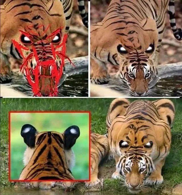 Like yes, if you take a photo of a tiger in the EXACT pose that OP has presented and then draw a face all over the tiger that includes those white spots, you’ll get what OP is describing. In reality though, for our dichromatic mammal friends, if they see a tiger at all they’d be looking at a green animal against a backdrop of green.