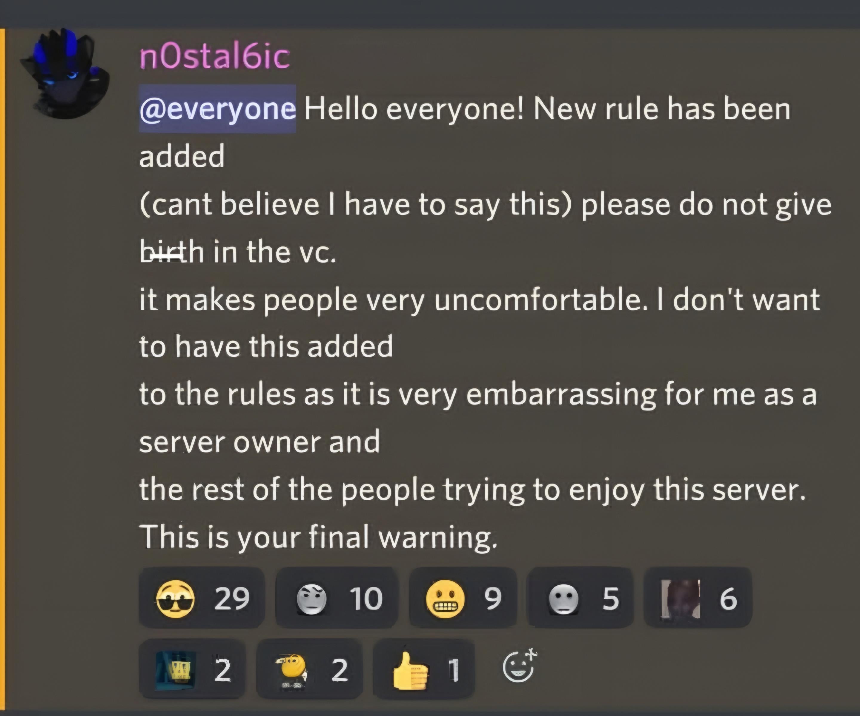 Surprising announcement from the “Give Birth on VC” Discord server. Really feel like they’ve gone against their core message.