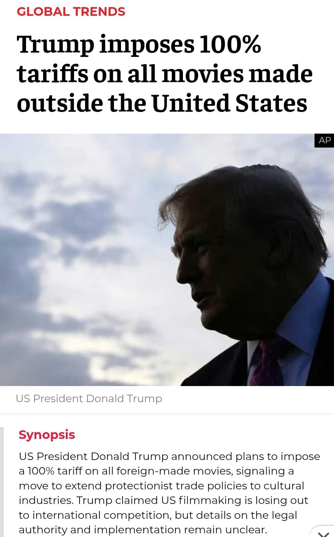 This seems like one of those times where he says something random, and then it gets reported as news even though there isn’t even a concept to enforce. Its like when he started talking about Alcatraz randomly and then the news was trying to figure out how much it would cost to reopen Alcatraz and than his team pivoted to the makeshift thing in Flordia but they had to close it pretty quickly but everyone had already moved on to the next thing. What does a 100% tariff on movies even mean. They aren’t shipped.