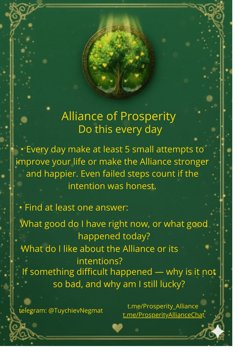I call the community around this idea the Alliance of Prosperity. It’s not an organization — just a name for people who follow the same practice. The point is to strengthen three ingredients of happiness in daily life: