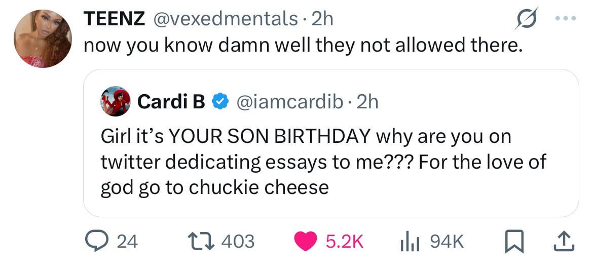 Cardi just peeking out of that 3 foot high condo she calls Nicki’s head.