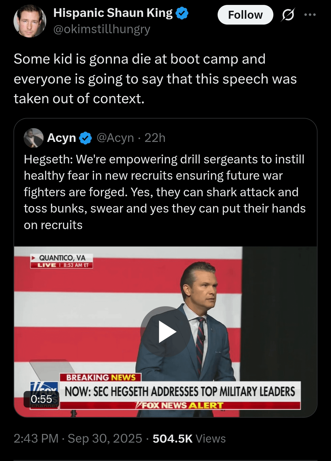 Fort Leonard Wood had a trainee suicide within the last month. Just wait until drill sergeants start hitting kids again and treating them even more shitty. Hegseth cosplays as a tough guy with no regard for the norms that have worked just fine to train our military.