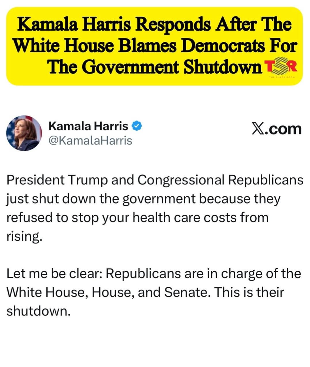 Former VP KamalaHarris took to X after news of the government shutdown broke. While the White House pointed fingers at Democrats, Harris set the record straight, reminding folks that Republicans control both the House and the Senate.