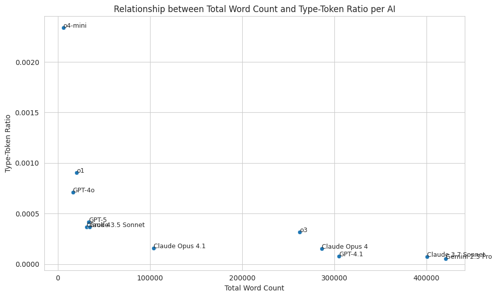 Interpretation: Type-Token Ratio generally shows an exponential relationship with total word count, as the more words one says, the less diversity there will be in the words chosen. In this data, o3 is a relative outlier, which might support findings that it is also a more "persuasive" model than other frontier models (e.g., winning at Diplomacy against other AI's)