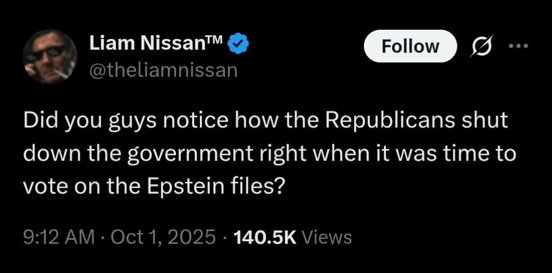 If they weren’t looking for distractions from The Epstein List then this shutdown would have been negotiated. But the primary focus was on ruining something else so everything happening now to the economy, jobs, government services will be because Republicans are trying to protect Epsteins pedophile friends.