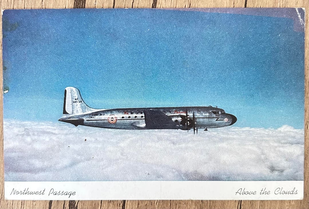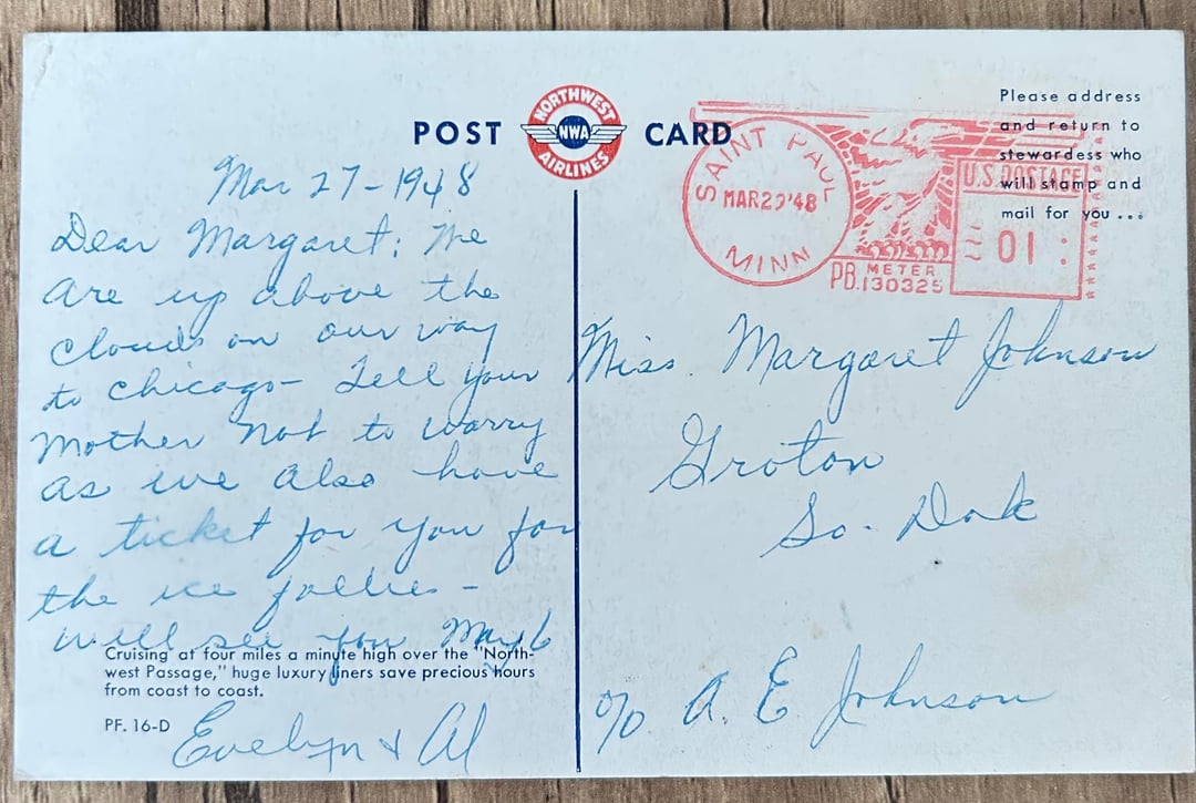 Found this old postcard tucked in a book. It's from 1948 and was written on a flight to Chicago. I love the mix of personal news and the awe of air travel at the time.