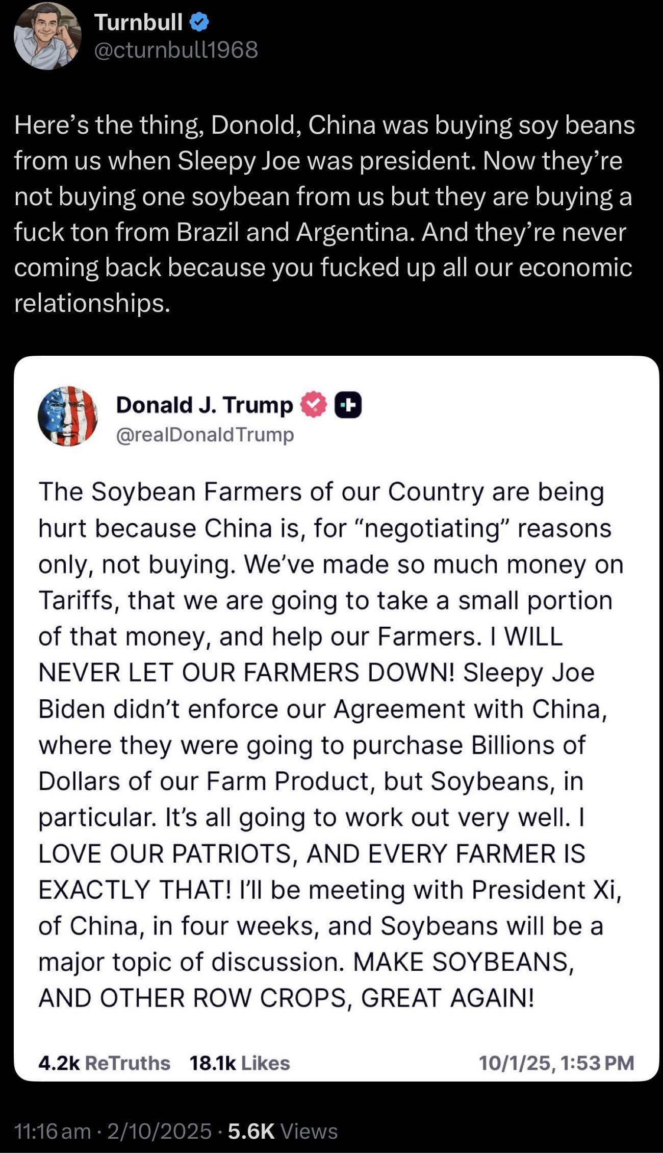 5. He let those soy bean farmers down in 2017-2018 and they still voted for him again. And he let them down again.