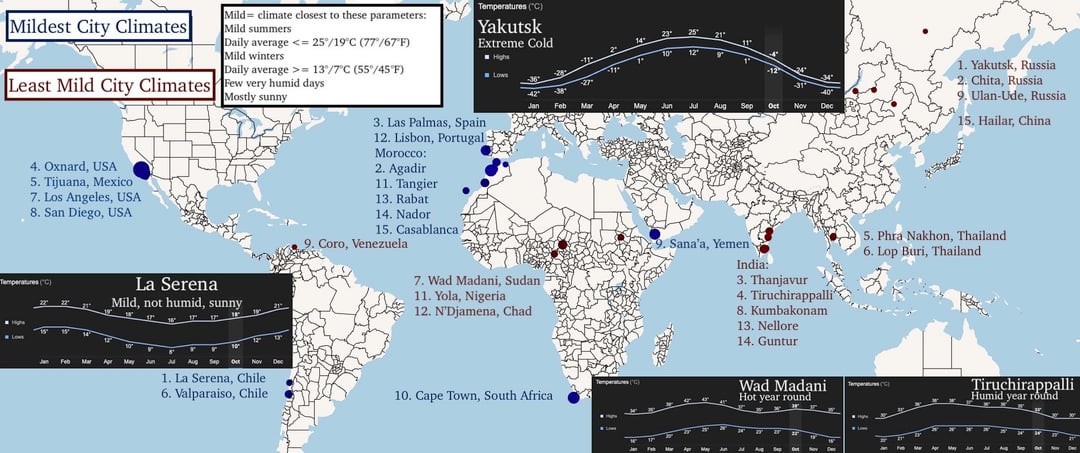 Compared to my previous post on “temperate climate index” I removed wind from the score, made it score hot desert cities a bit lower and made it 0-100%