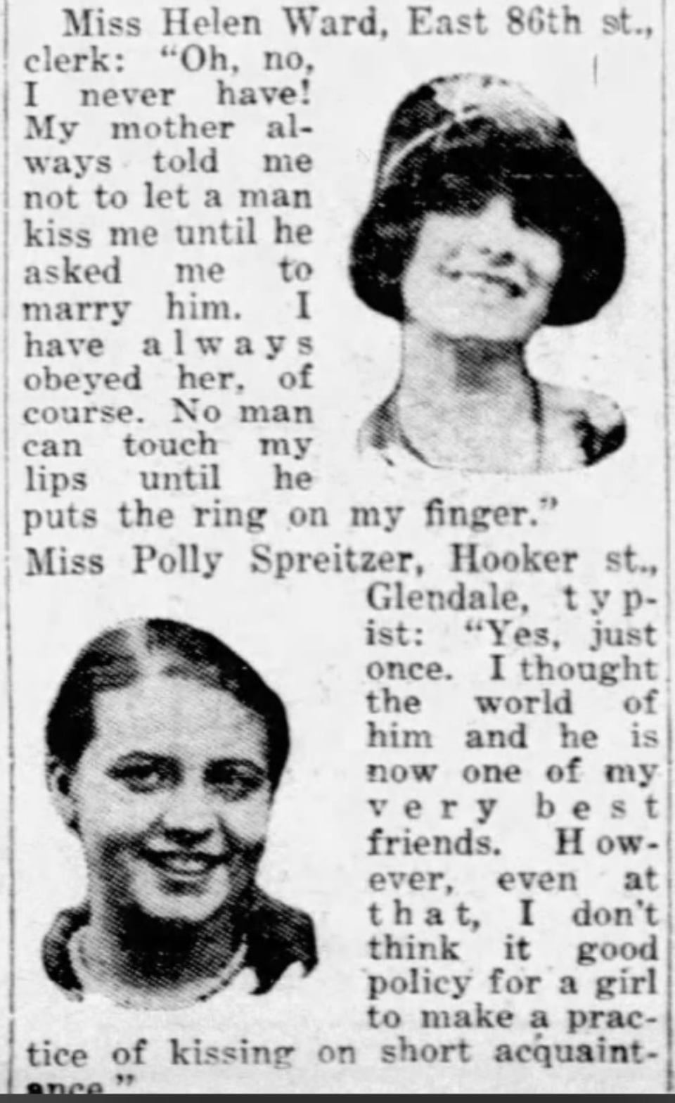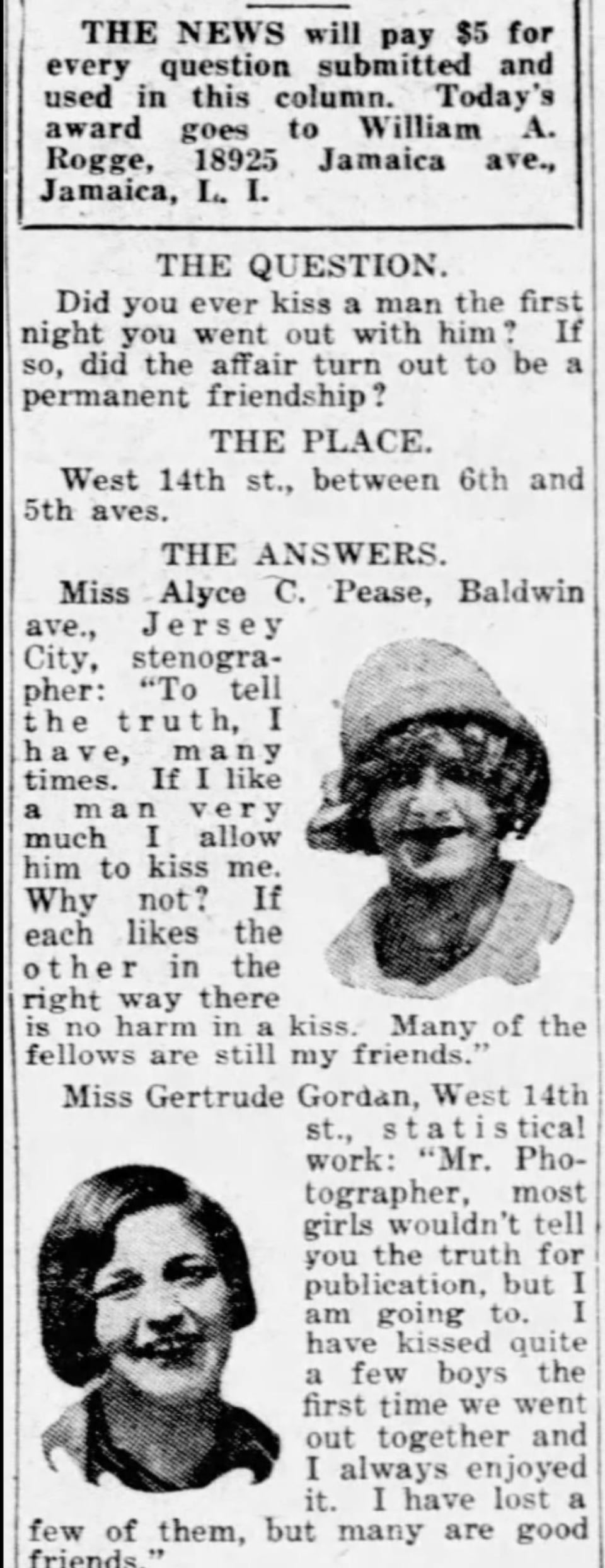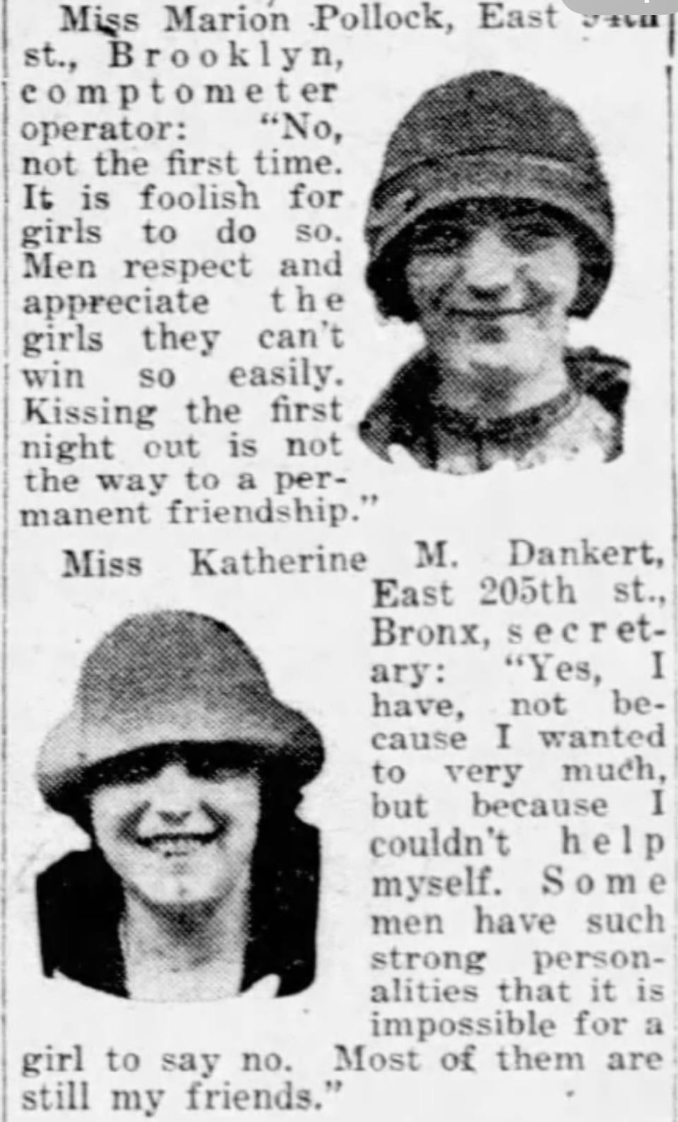 Inquiring Photographer:”Did you ever kiss a man the first night you went out with him? If so, did the affair turn out to be a permanent friendship?”September 20,1925