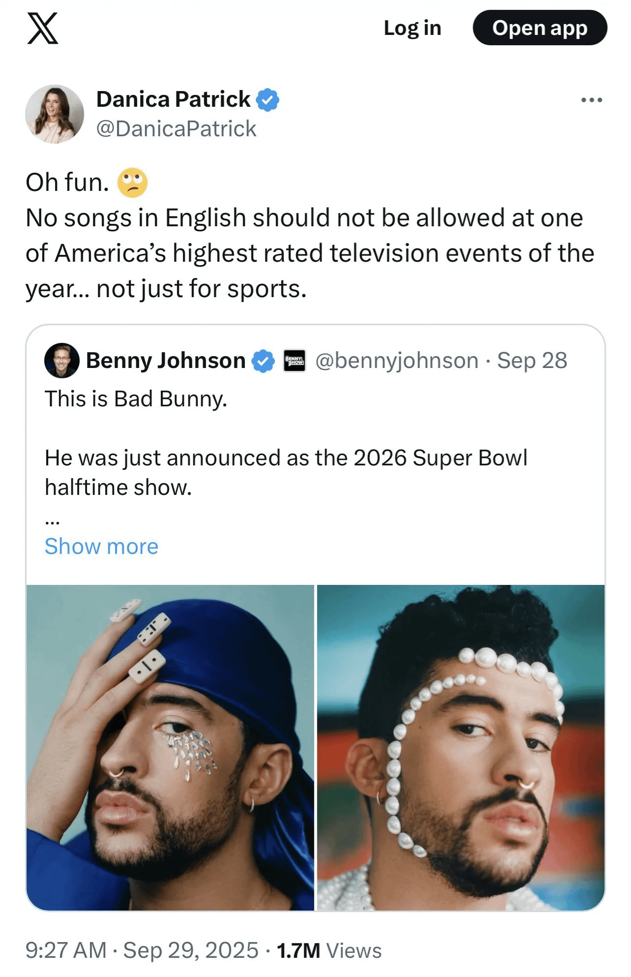These idiots pushing back on Bad Bunny jfc they are stupid. I’m not even a fan of Bunny but this is turning me into one! Dude’s a fucking American just like Danica and yet she can’t wrap her damn ass head around it.