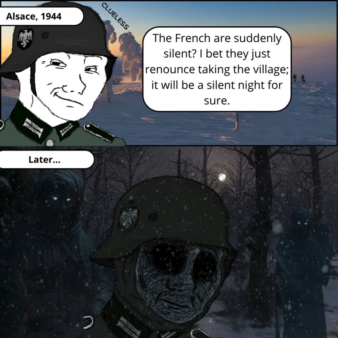 *Picture yourself as an American soldier in the Alsatian winter of 1944, keeping watch beside a campfire. The night is eerily silent, your thoughts drifting to home. Suddently, a hand seizes your throat, accompanied by the chilling sound of a knife sliding from its scabbard. The unseen figure searches your chest, grasps your dog tags, and briefly clinks the two metal pieces emblematic of the American soldier before sliding back into the darkness.*
