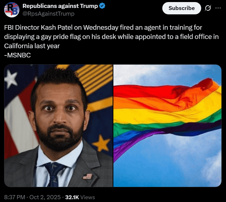 The FBI fired someone for having a pride flag on their desk before Trump even took office.