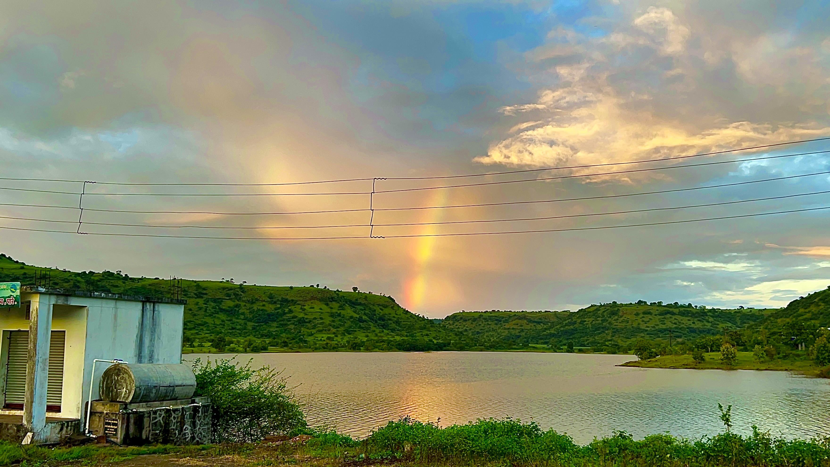 I was near the lake when I spotted this rare rainbow fragment glowing in the clouds. There was no rain where I stood — just a patch of mist/rainfall over the hills that caught the low sunlight. Instead of a full arc, only this vertical slice of the rainbow lit up, making it look like a rainbow beam in the sky.