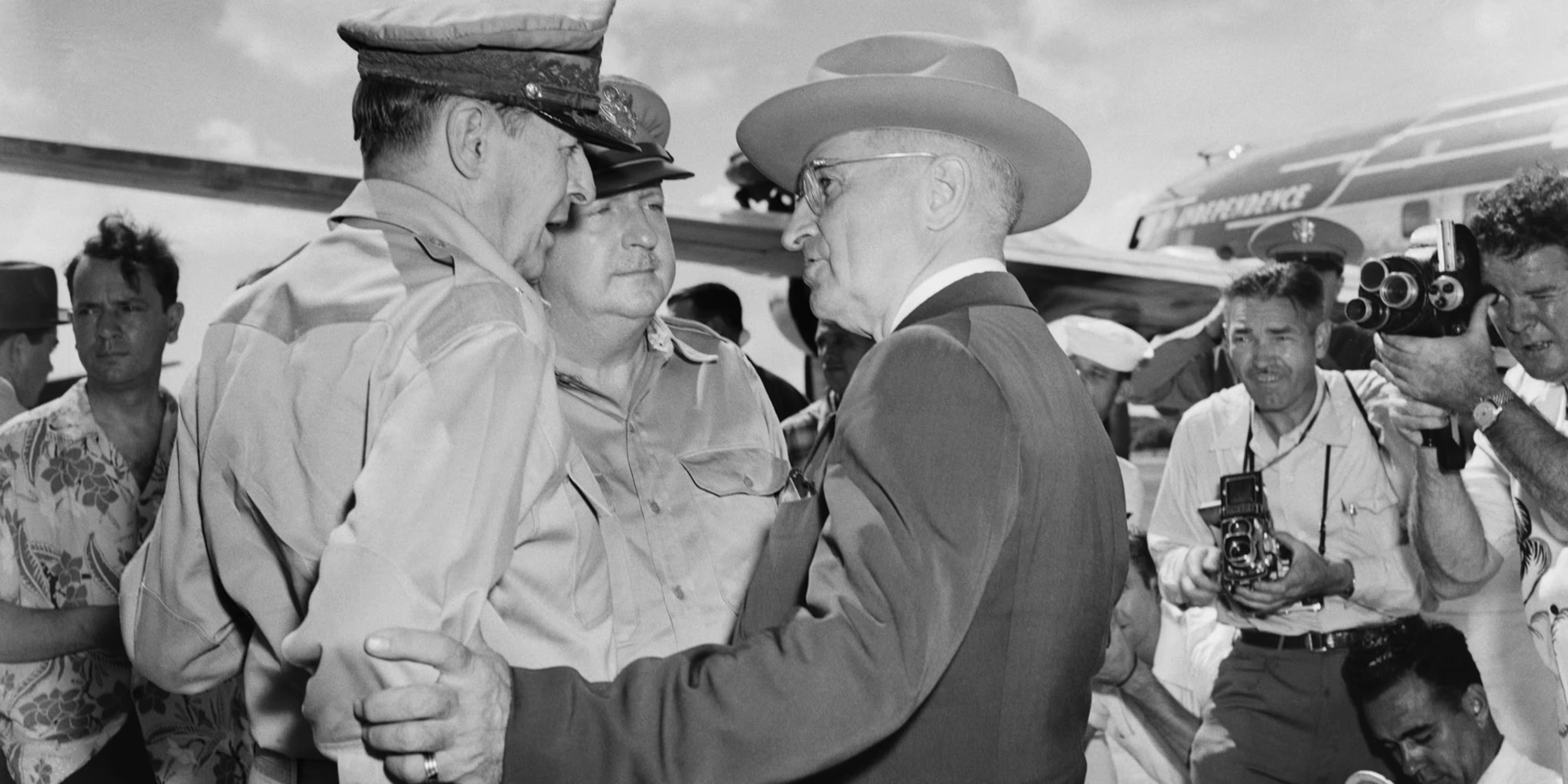 US President Harry Truman speaking with General & Far East commander Douglas Macarthur in 1950, 7 months before Truman fired him over disagreements regarding the handling of the Korean war (3840×1920)