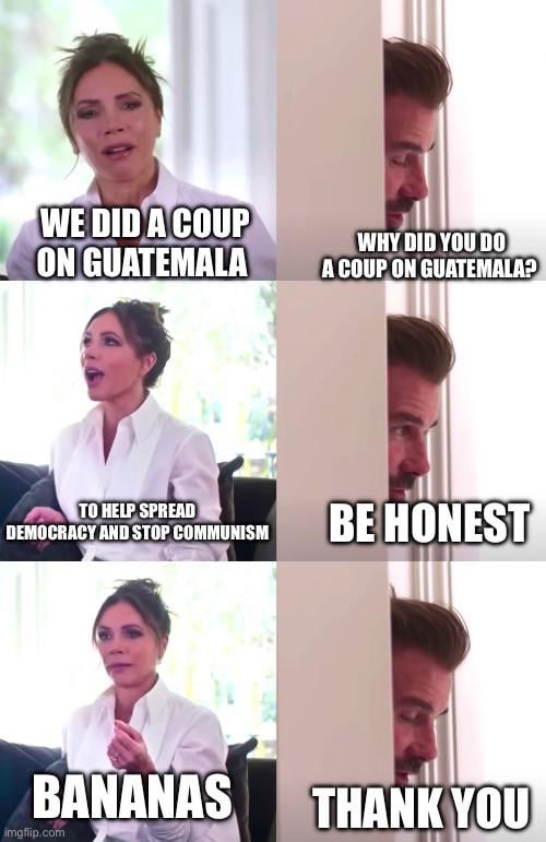The fact that a sovereign country decides to operate on a different economic model (whatever your opinion on communism and its efficacy is irrelevant, it still doesn’t justify genocide) being accepted grounds for regime change is wild, let alone the actual reason being that the fruit companies wanted a monopoly on banana plantations and were willing to genocide the mayan descendents to obtain it. To this day they’re still suffering the effects of the genocide committed by US backed death squads.