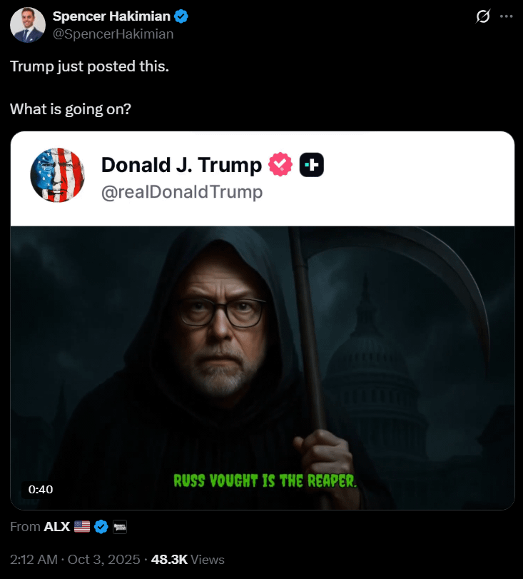 This lunatic is threatening people’s jobs if democrats don’t capitulate. Basically this guy wrote the project 2025 playbook which stated to fire most government employees. Trump is saying he’s going to hey with him to see who to fire during the shutdown.