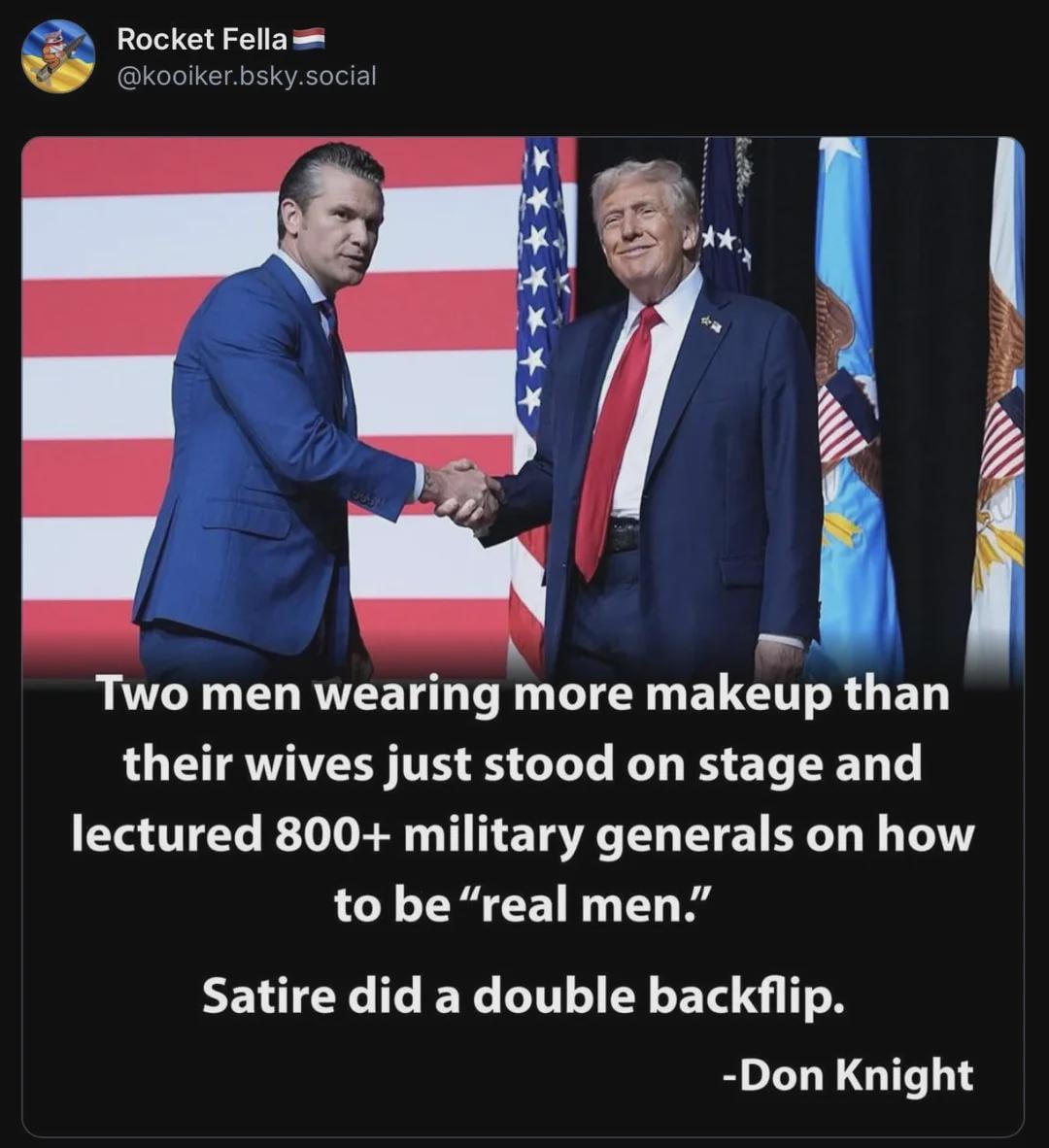 Peroovian on October 3, 2025 3:56 pm “No fat generals. But the commander in chief is allowed to be obese”