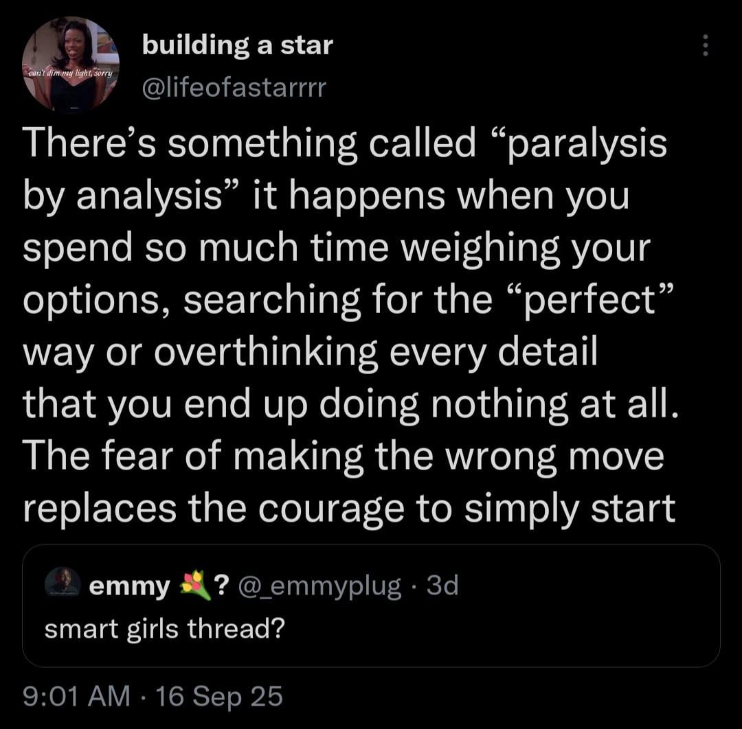 My old job used to call that getting wrapped around the axel. You keep spinning and spinning and get nowhere. Sometimes you gotta make a decision even if it’s wrong to help you understand what is right.