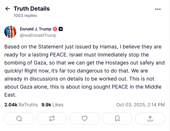 The leader of the Al Qassam Brigades (Armed wing of Hamas) just said earlier that he won’t accept Trumps peace deal. And since all the other leadership is somewhere out of Gaza, IF they even wanted peace, it would not matter, because the guy who runs their armed wing is actually in Gaza and won’t put down his weapons.