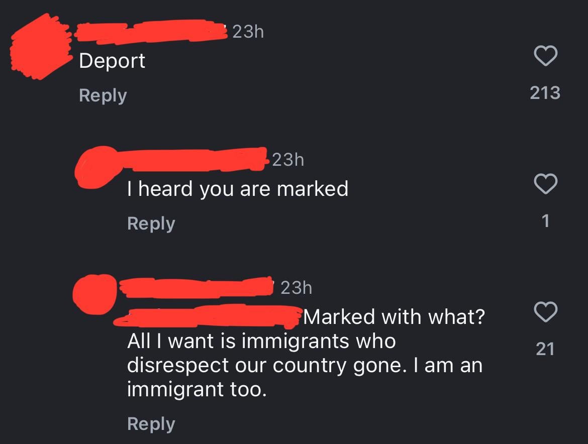 Comment thread I came across: guy starts with a blunt “Deport” aimed at immigrants, then later explains he only wants to deport those who are “disrespectful.” The kicker? His first comment is disrespectful itself. By his own logic, he wouldn’t pass his own test..