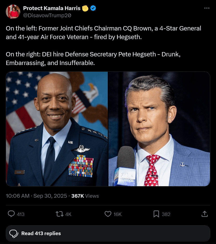 # On the left: Former Joint Chiefs Chairman CQ Brown, a 4-Star General and 41-year Air Force Veteran – fired by Hegseth. On the right: DEI hire Defense Secretary Pete Hegseth – Drunk, Embarrassing, and Insufferable.