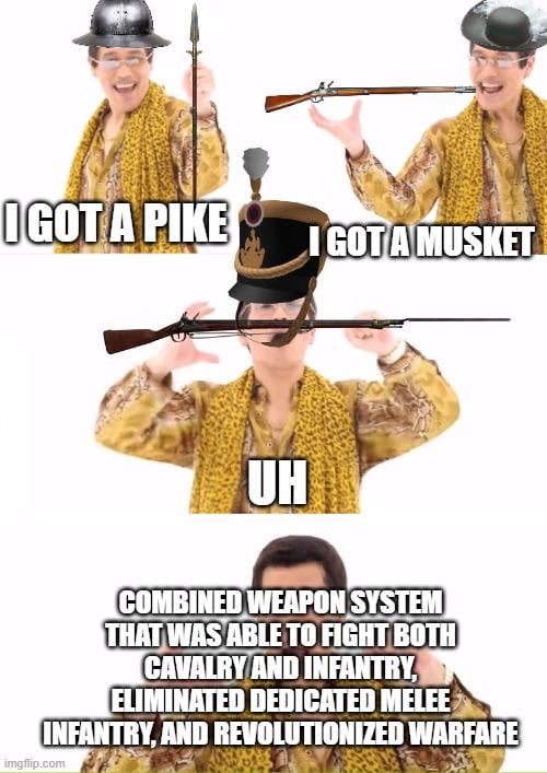 Ridiculous that it took like 200+ years from inventing the gun to realising you should stick a spike on it.