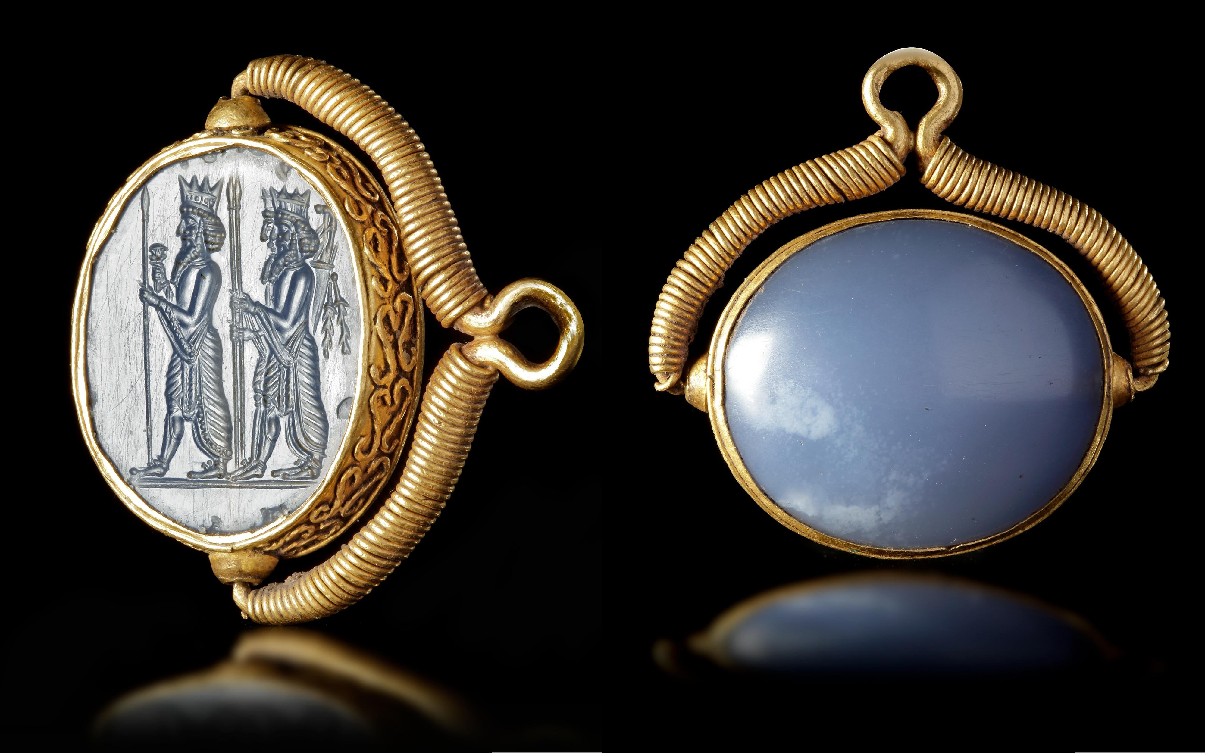 One of the few remaining Achaemenid seals, a Persian masterpiece made of blue chalcedony in a gold mount. Dating to 465–424 BC, it belonged to King Artaxerxes I and is housed in the National Museum of Iran. [4000×2500]