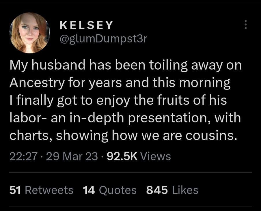 Shit I didn’t need ancestry to find out my wife was my cousin.