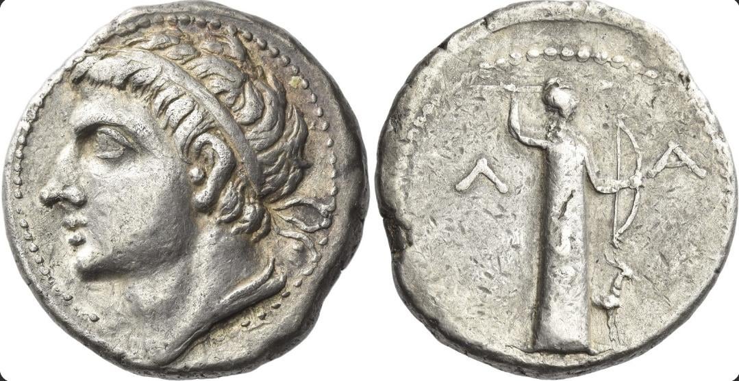 A Tetradrachm of Spartan King Cleomenes III (235-222 BC), depicting a cult statue of Artemis Ortheia. [1079×557] by coinoscopeV2