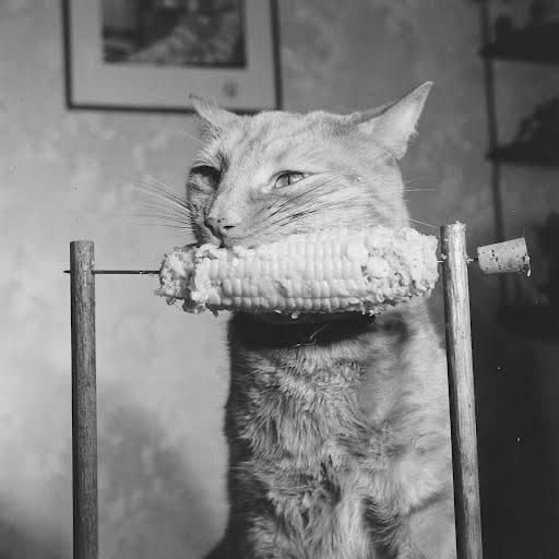 Cat eating corn, photo by Allan Grant in Life Magazine, 1951