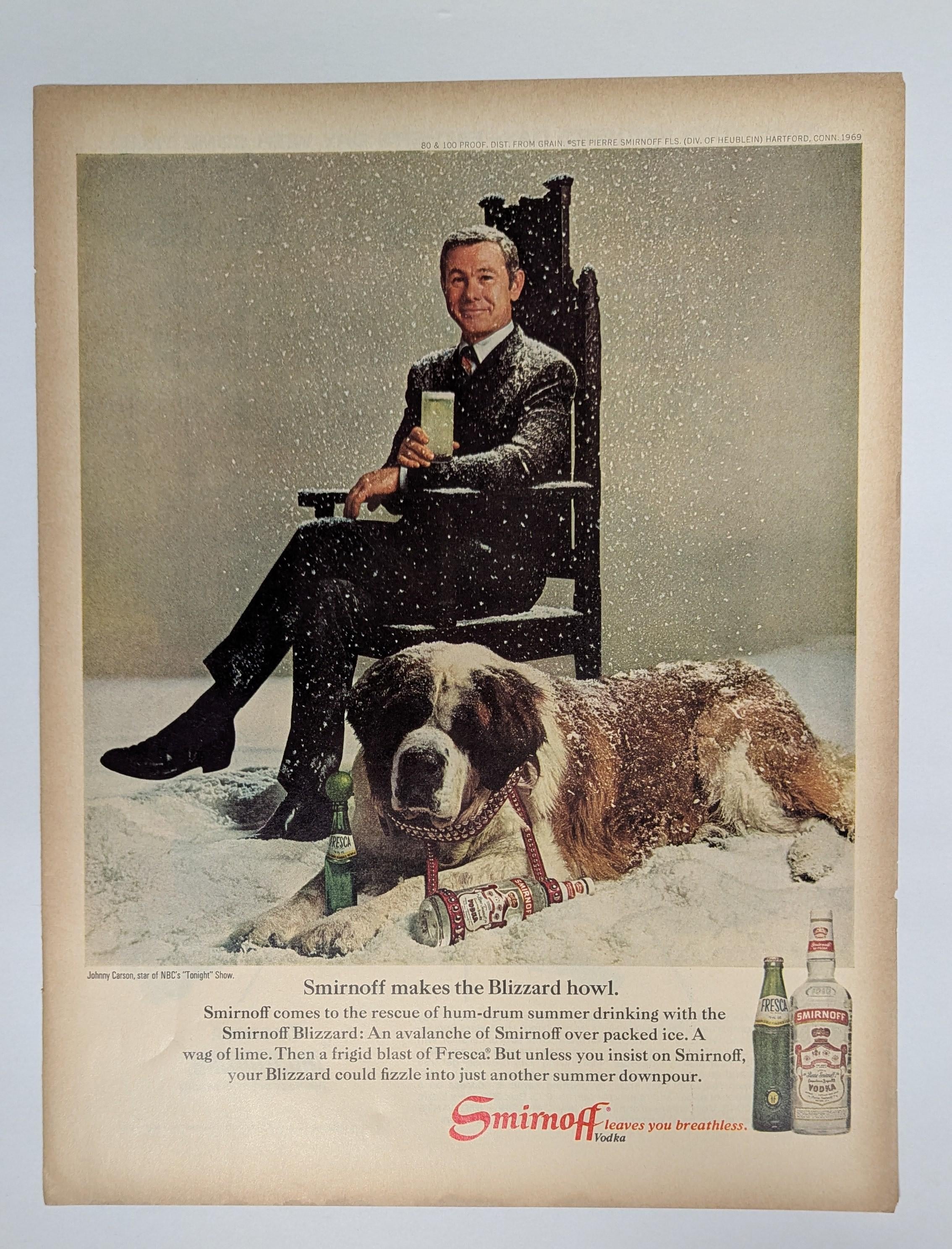 Johnny Carson (then host of The Tonight Show) poses in a snowstorm with a St. Bernard dog to promote the Smirnoff Blizzard, a mix of Smirnoff, ice, lime, and a blast of Fresca.