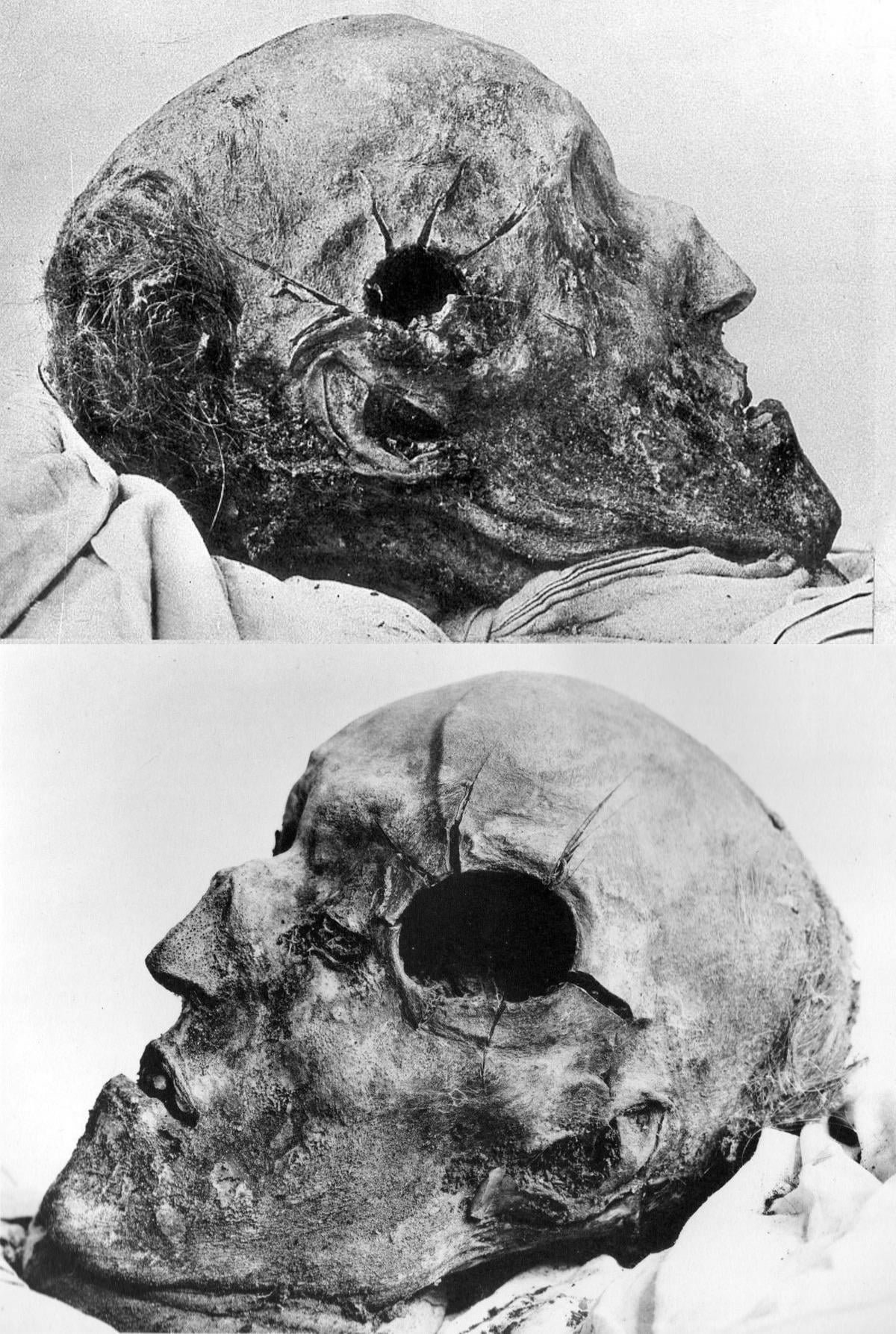 The head of the slain Swedish king Charles XII, killed in 1718 by a projectile while inspecting his troops’ lines during the siege of Fredriksten in Norway. The shot struck the left side of his skull and exited from the right. These photos were taken during a 1917 autopsy [1200×1787]