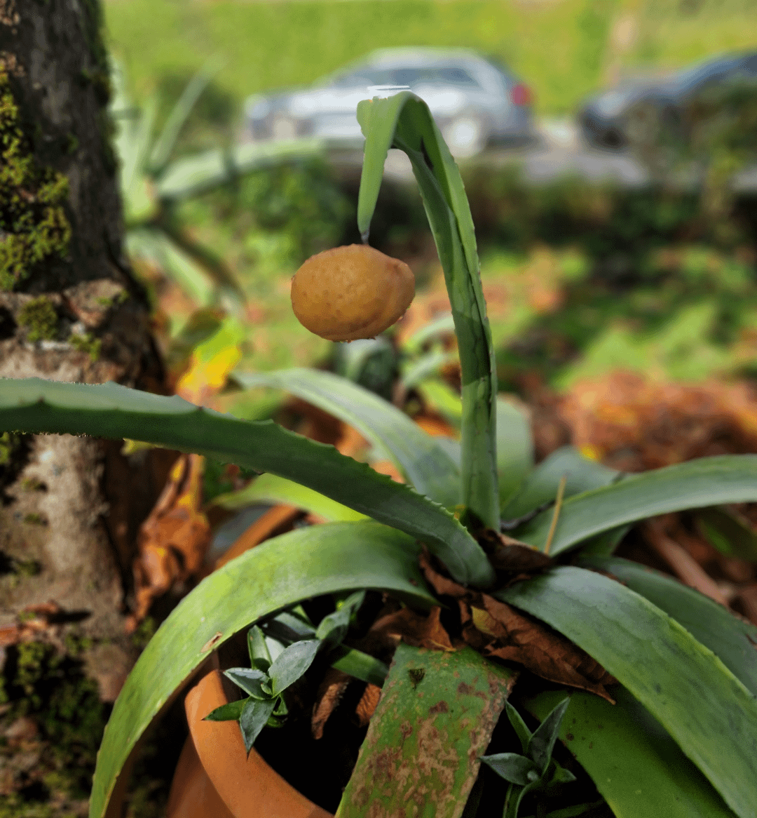 This chestnut fell from a tree and was impaled in flight by an aloe vera leaf