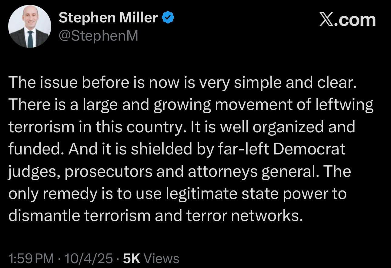 Dear America and Americans. What this guy is saying is that anyone who doesn’t bow down and kiss the ring, is automatically going to be labeled a left wing terrorist! Look how they have portrayed all the political shooters!! All clearly disturbed white men who worship trump. What do republicans do? Find any which way to link any of them to the left. Now they can just say you’re a left wing terrorist and there’s no more innocent until proven guilty.