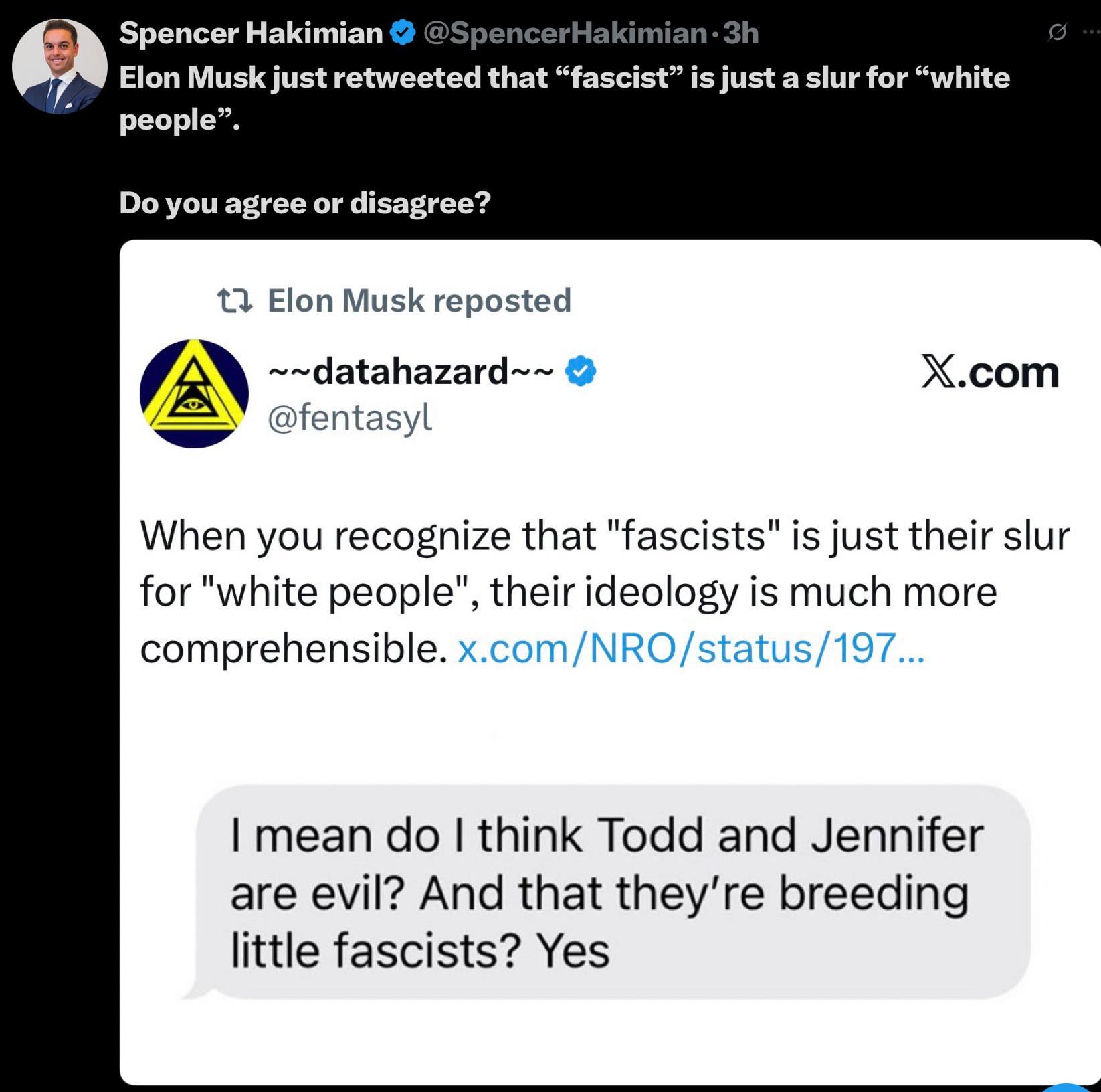 Pretty sure that this is one of those not all facists are white supremacists but all white supremacists are facist situations. Elon is definitely both