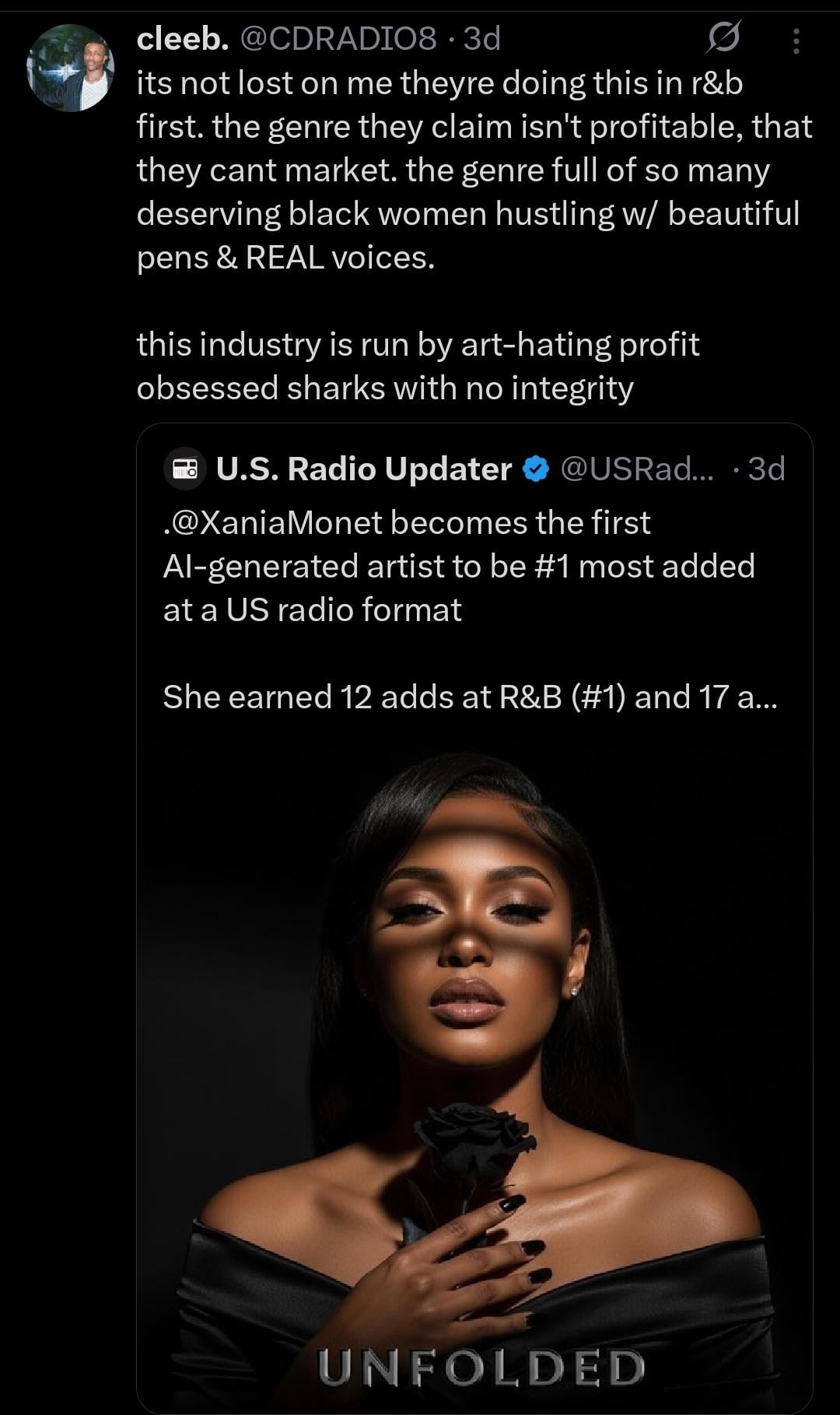 Never in my life did I ever think I would see “AI generated artists” as if there aren’t REAL people out there making music 🤦🏽‍♂️