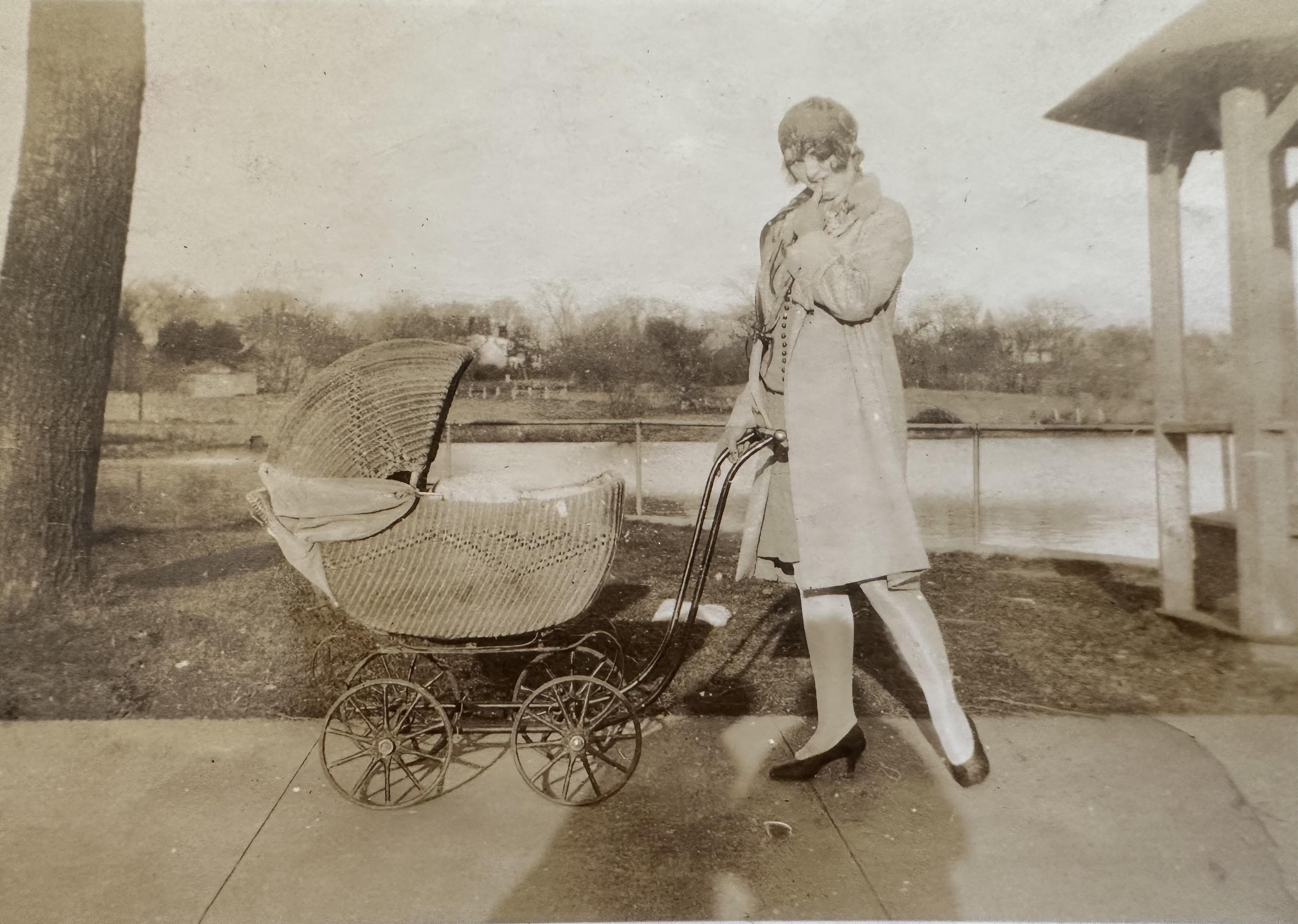 Late fall or a nicer day in winter perhaps, but she’s wearing a coat and the trees are missing leaves. I see the shadow of two people on the pavement so the photographer and maybe the neighbor?