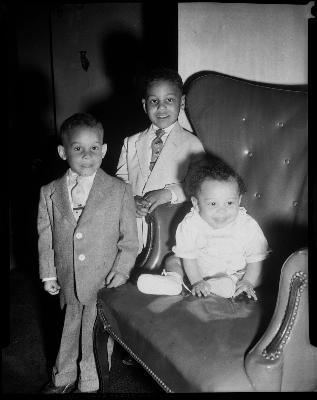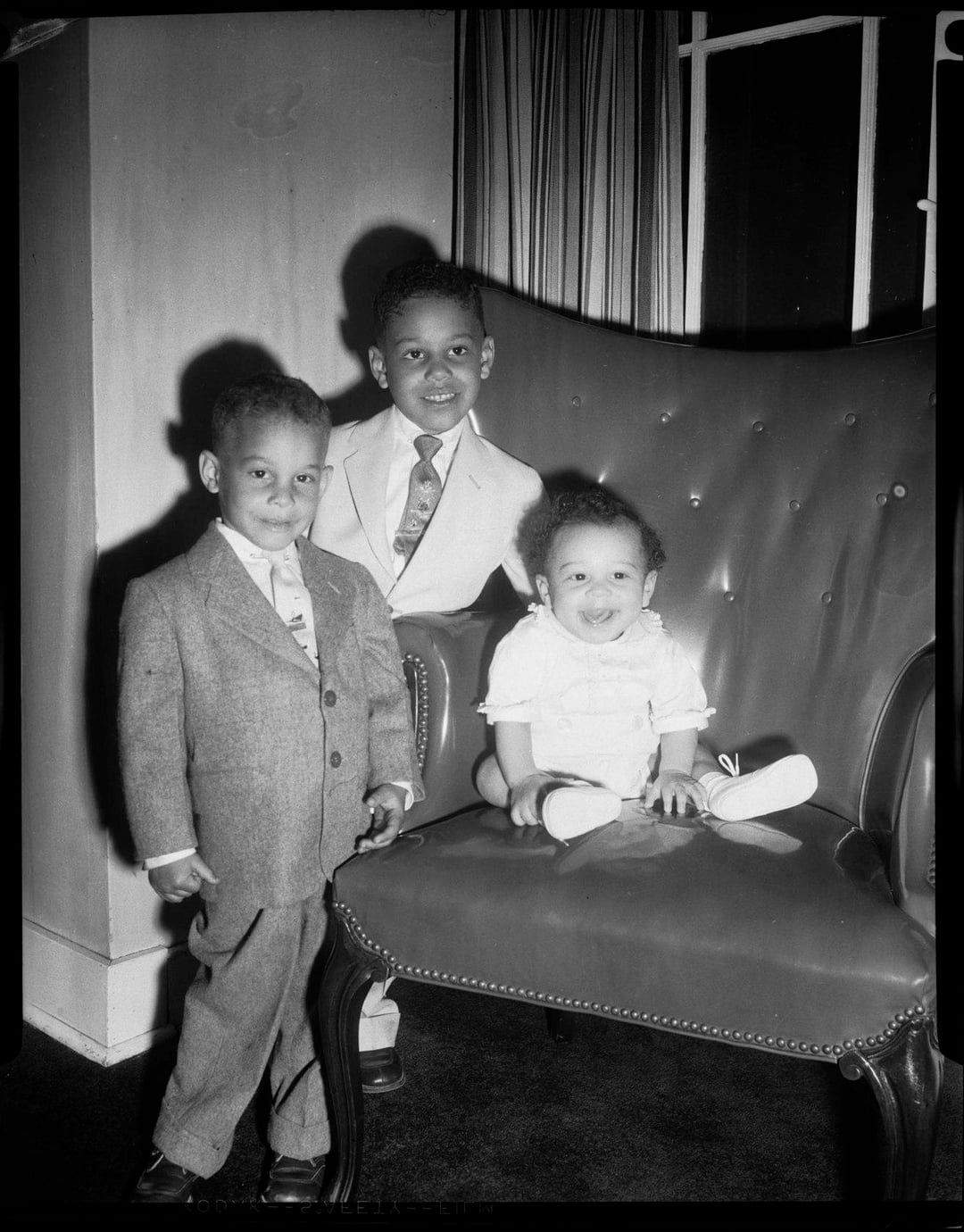 Trio of childre with baby brother on the leather armchair while big brothers stand in sharp well fitted suits with some tie jewelry, circa 1945. safety film. Baby is so happy with all