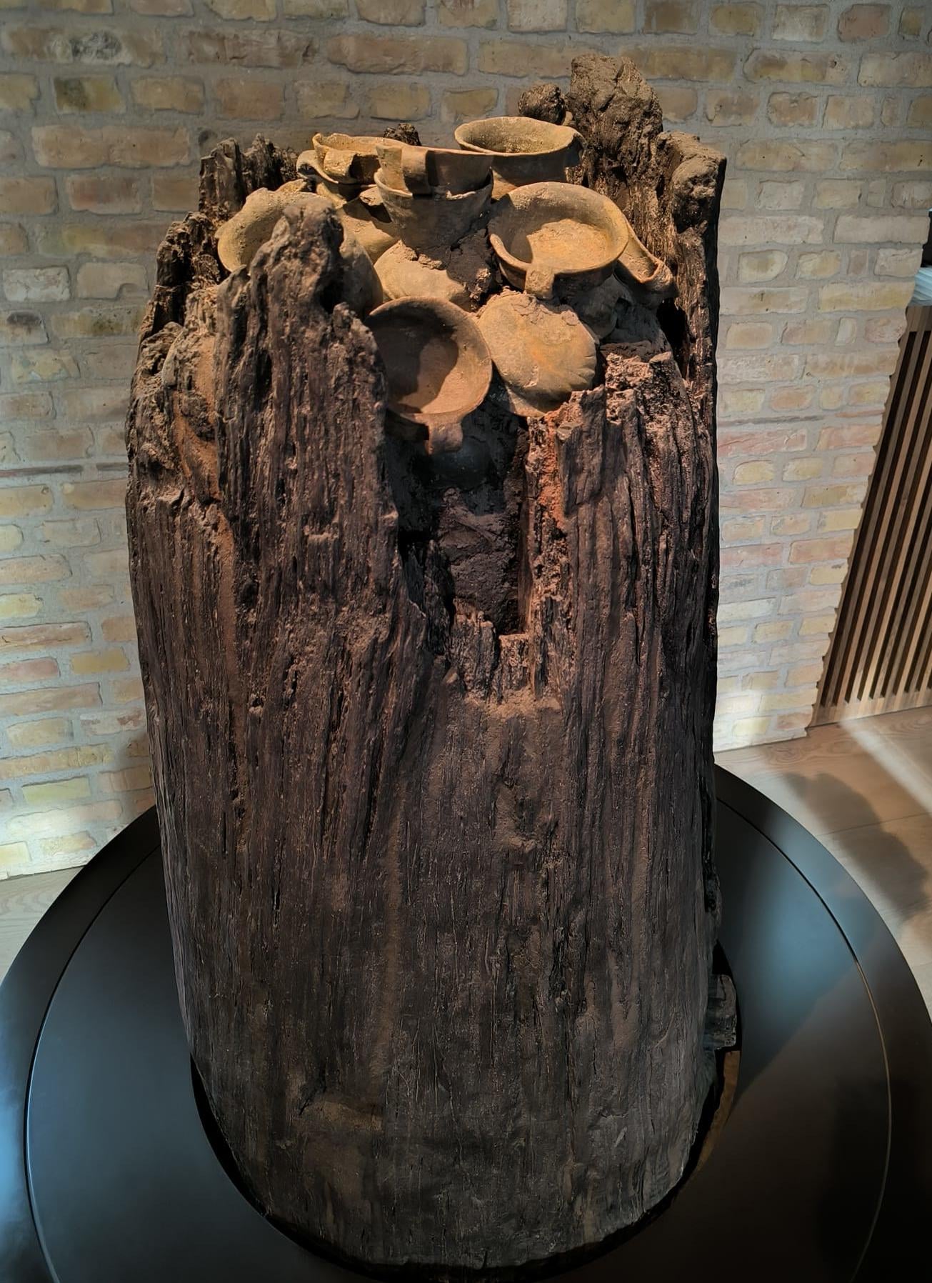 Fascinating story behind it: Discovered in 1958. This had started out as a water well, cased with a tree stump. Pieces of earthen vessels were found at the bottom, presumably accidentally dropped while collecting water. At some point the well dried up, and the stump was used as a beehive. Later a grass lined wooden frame was constructed inside it, on which were arranged the containers we see in the pictures, as votive offerings, on top of, and side-by-side with one another. Most of the containers had remnants of plant materials, some of the "intoxicating" kind, as worded by the museum.