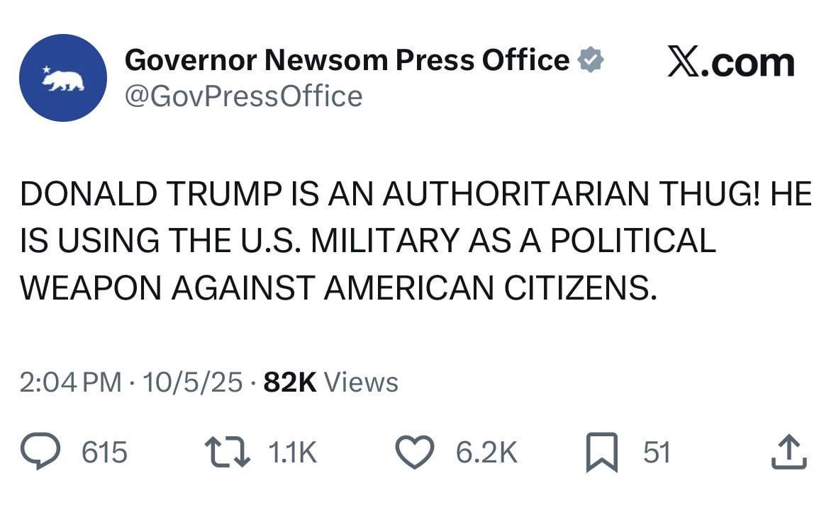 LimeKey123 on October 5, 2025 10:13 pm From here on out, you’re President Newsom and should sign your tweets accordingly…