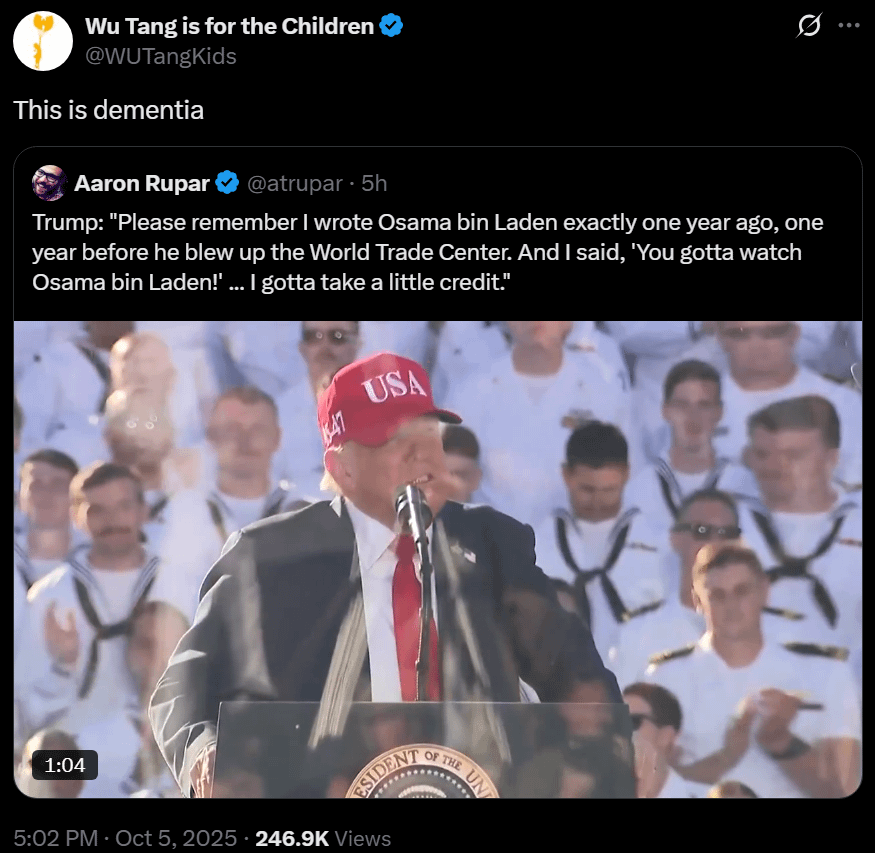 I think this is more of an “I told you so” though I admittedly cannot fathom who we are expected to believe he told and allowed 9/11 to happen because they didn’t listen to his obviously well informed assessment of the situation