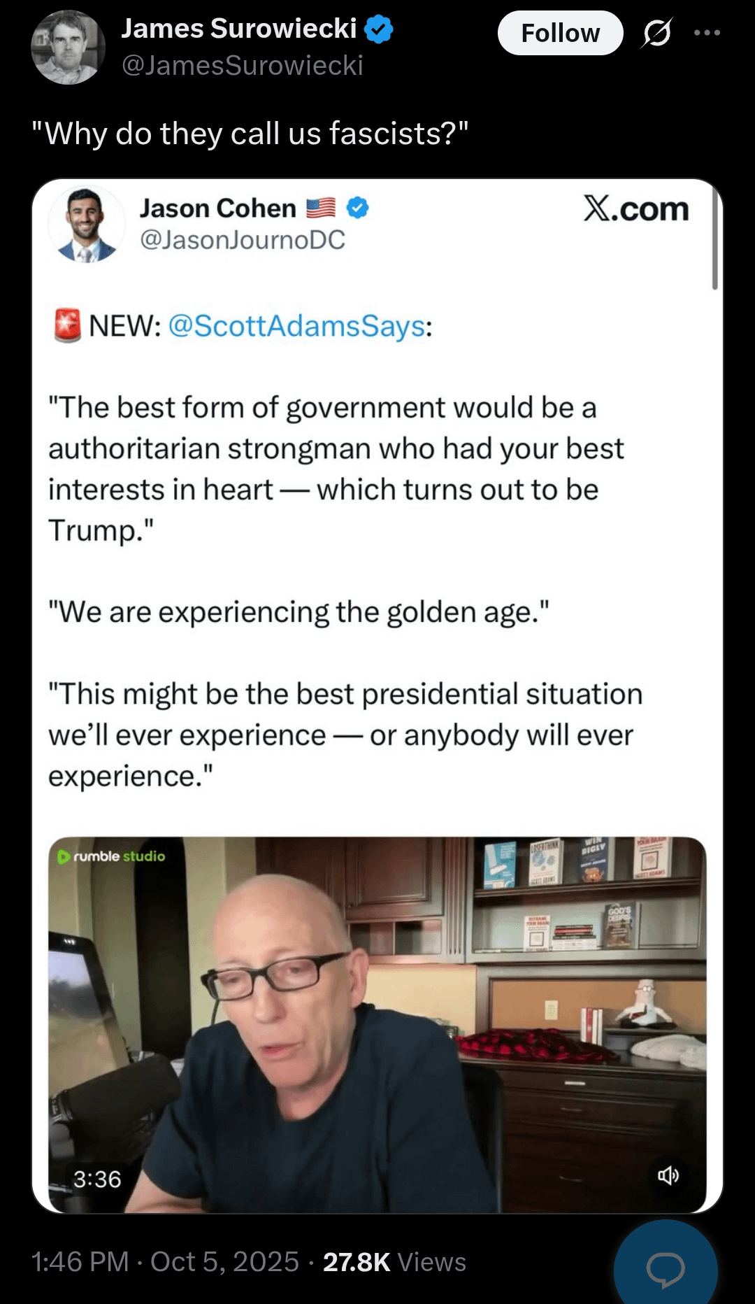 Absolute deference to an alpha male strongman daddy dictator is the most cuck shit possible. “Finally, daddy’s home to make our decisions for us” is some cuck shit. Trump is a conman millionaire out there bragging about fucking people’s wives and daughters, and hangers-on like Scott Adams are here to say, “yes, thank you, sir!”