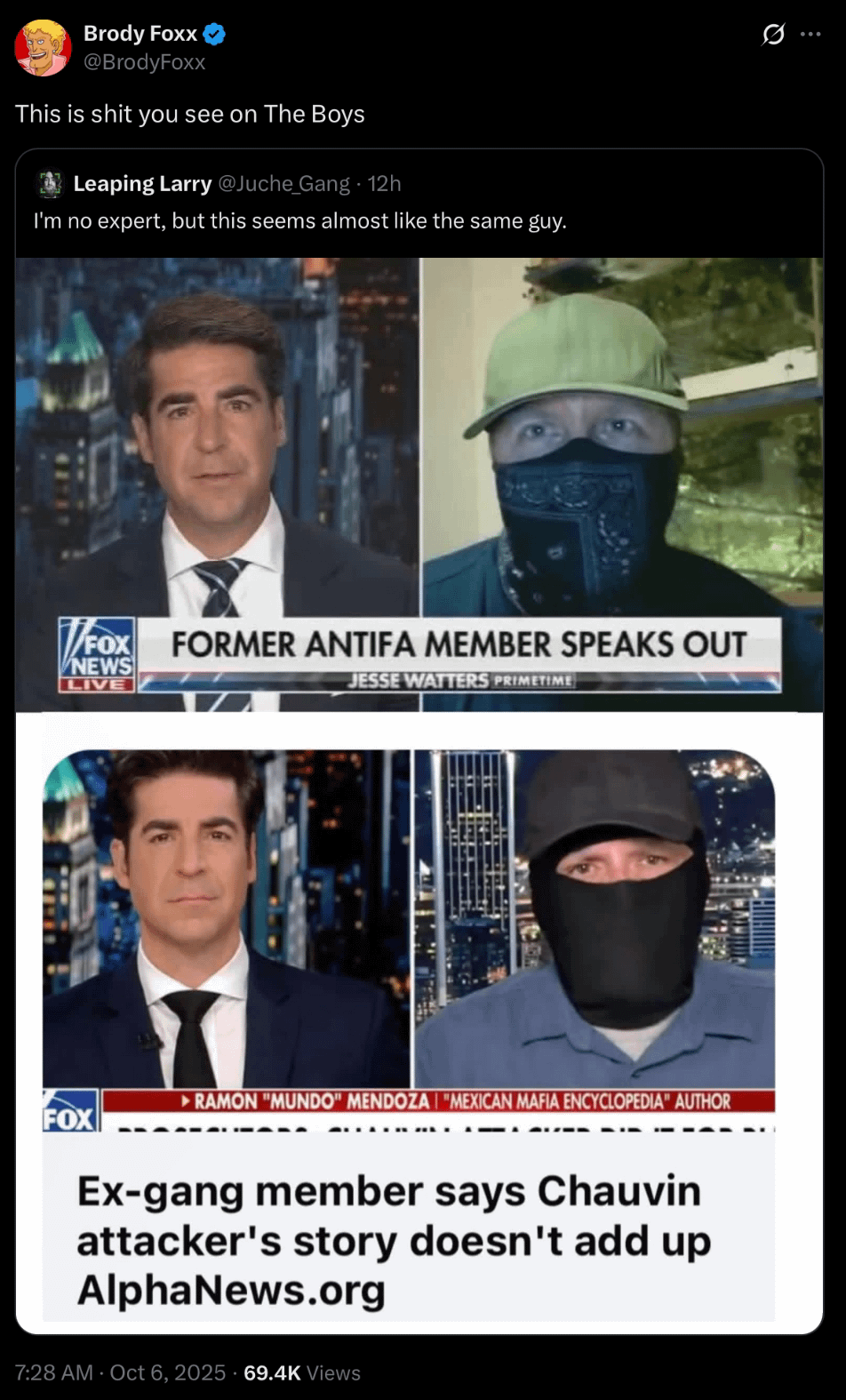 isecore on October 6, 2025 9:04 am Of course it’s a fake. Some staffer got told to put on a mask and do a fake “interview”. This is just more false flag bullshit from these assholes.