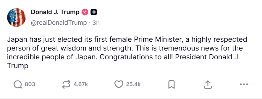The only reason he likes the fact that Takaichi Sanae won is because she’s known for being a right-winger and a nationalist with warhawk tendencies. She’s also a historical revisionist with regard to Japan’s actions in WWII. My personal opinion is that there’s nothing good about her winning.