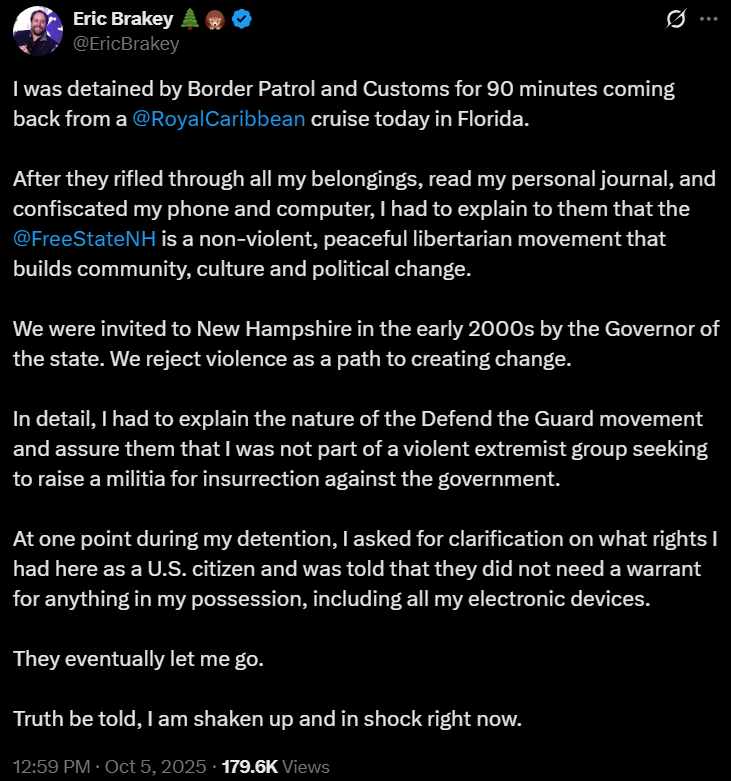 Libertarian who voted for Trump detained at the border and forced to explain how his political movement wasn’t planning an insurrection.